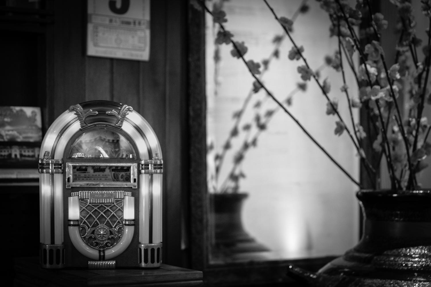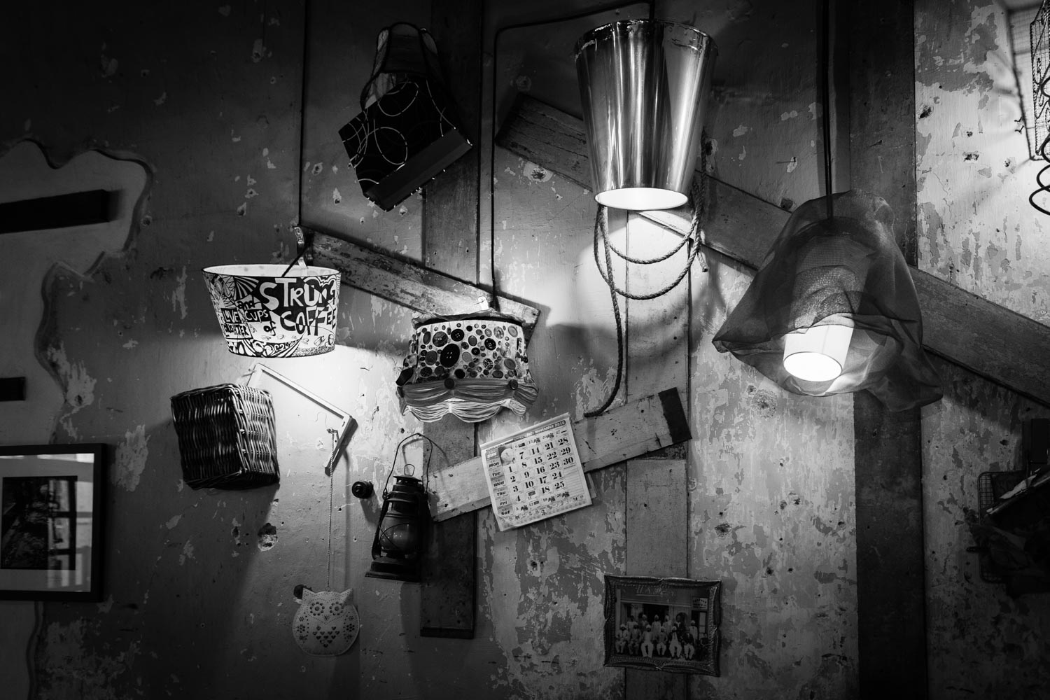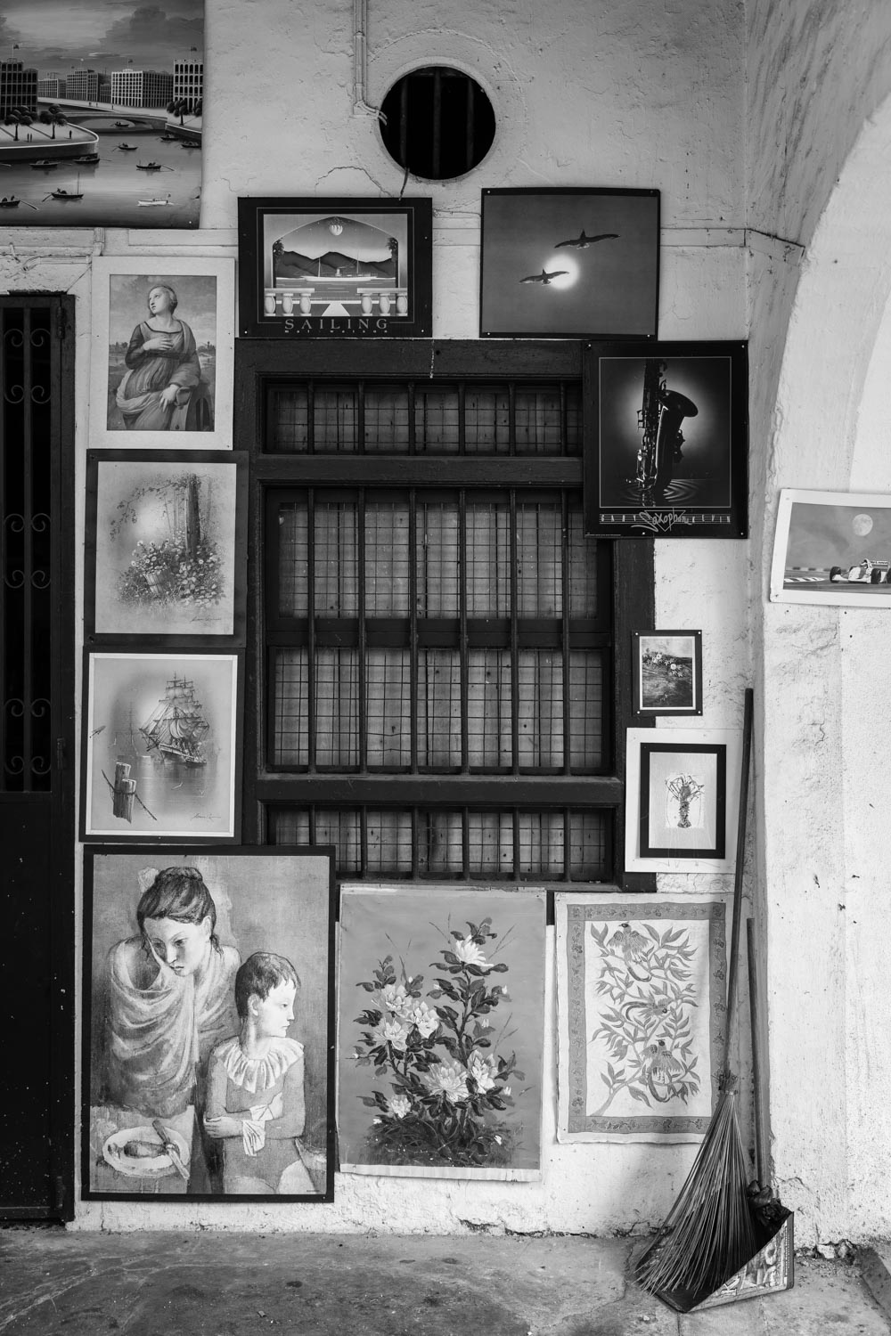 Photographs and prints surrounding a doorway in Concubine Lane.