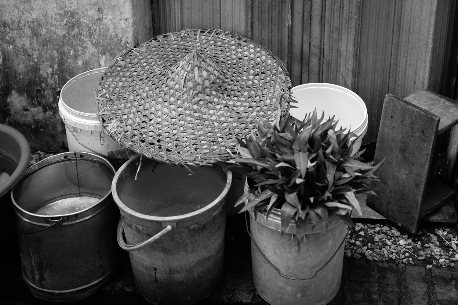 Pandan leaves rinsing in a bucket.