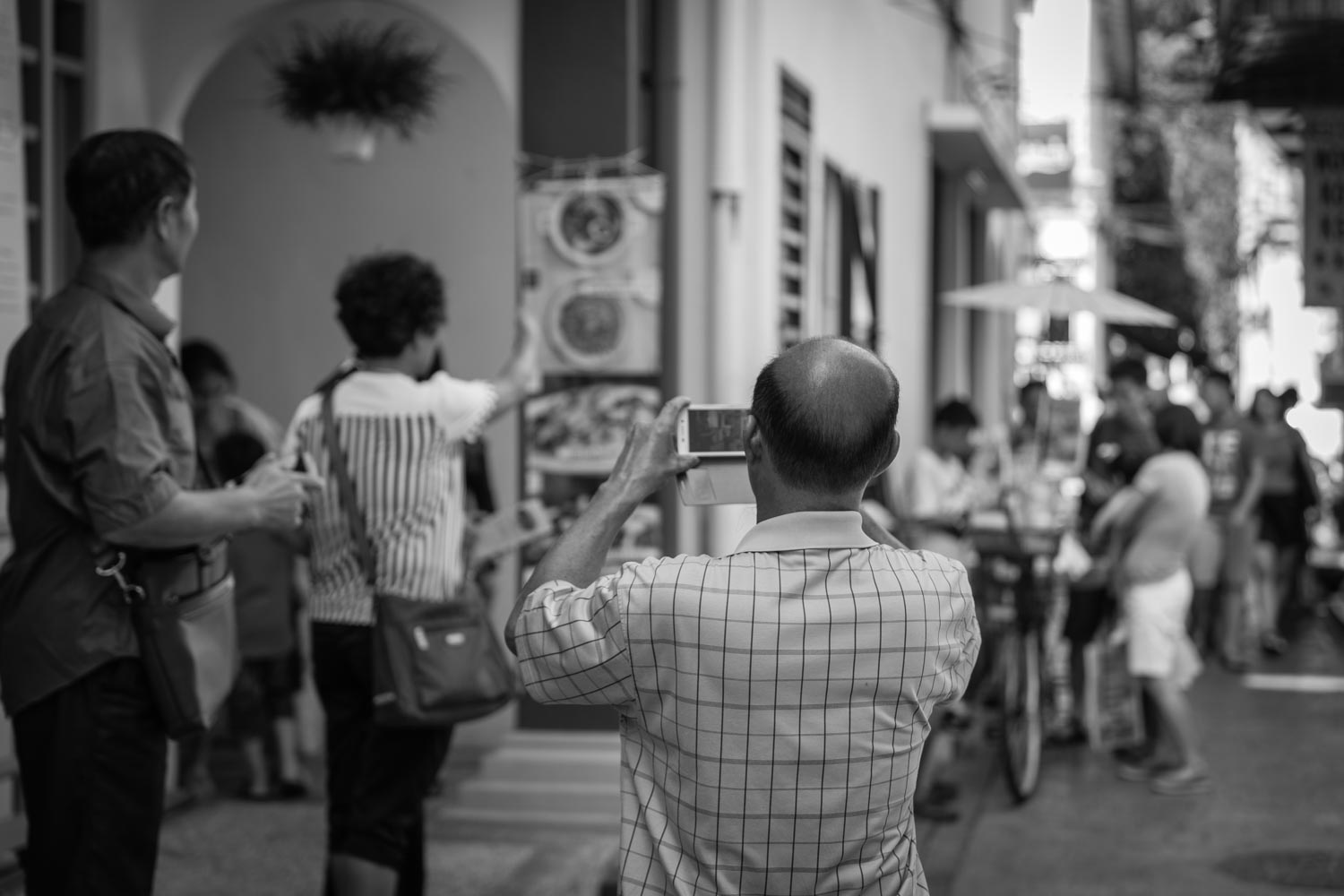 Tourists touring Concubine Lane taking photos with their phones.